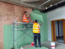 ①内部隔断已进行至60%,除东南角隔断外,其他隔断填充岩棉后即可进行*后一面的施工;